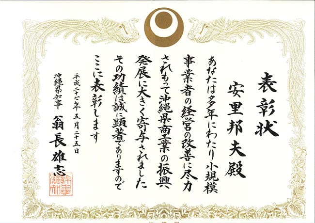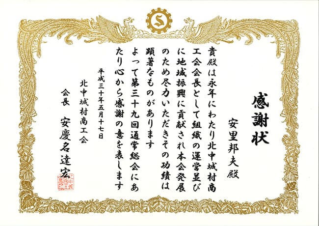 | 平成30年5月17日 | 感謝状 | 安里邦夫社長が永年(9期27年間)にわたり、北中城村商工会会長として組織の運営ならびに地域振興に貢献、商工会発展のために尽力 | 北中城村商工会 |