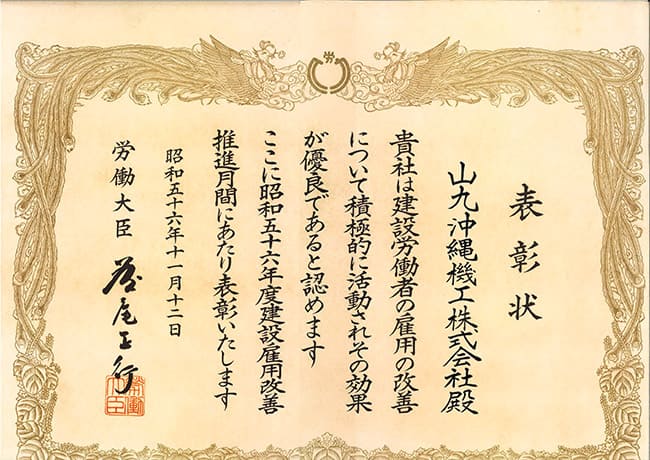 | 令和7年12月19日 | 表彰状 | 安全衛生に関して2009年12月以降無災害を達成し安全衛生努力賞を受賞 | 沖縄プラント工業株式会社 |