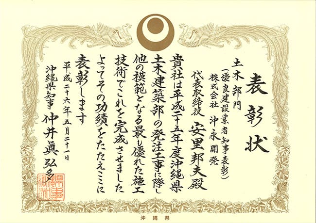 令和3年度沖縄県土木建築部の工事完了に際し誠意をもって施工にあたり優秀な技術力をもってこれを完了させその功績を称える |