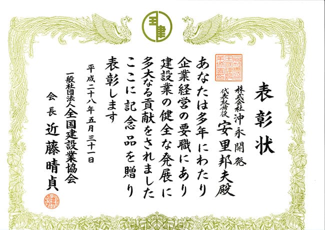 (株)沖永開発に入社以来長年(38年)にわたり多くの現場で優秀な実績を築き社員やお客様からの信頼も厚く会社の発展に大きく貢献、会員企業従業員表彰状を受賞 |