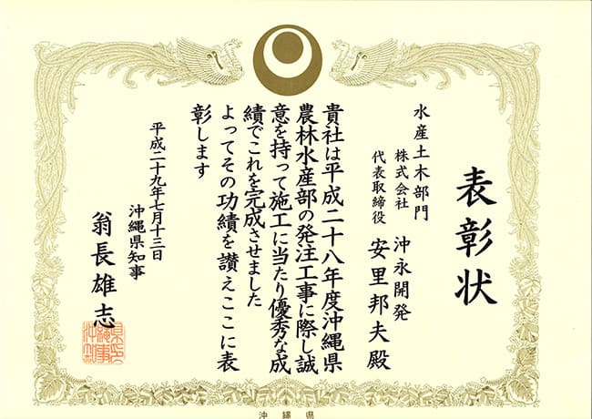 令和六年度沖縄県農林水産部発注、沖縄地区(中城)中層型浮漁礁回収設置工事(R5ゼロ国)に際し誠意をもって施工にあたり優秀な成績で完成させた功績をたたえられ優良建設業者として評価され受賞 |