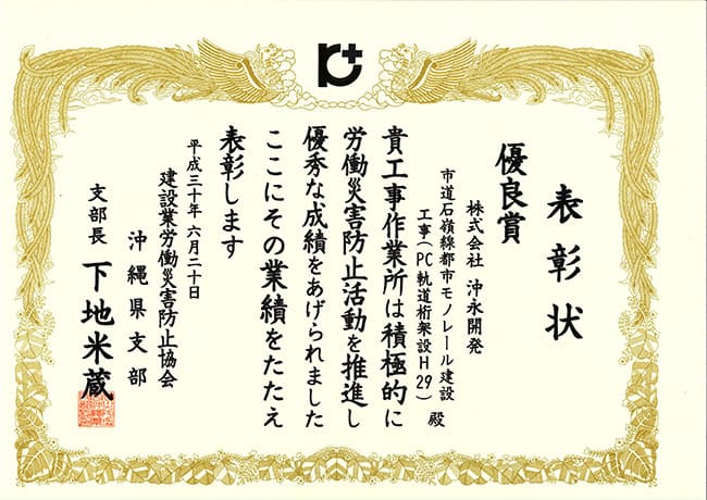 | 平成30年6月20日 | 表彰状 | 積極的に労働災害防止活動を推進し優秀な成績を上げ、その業績を讃え表彰 | 建設業労働災害防止協会沖縄支部 |