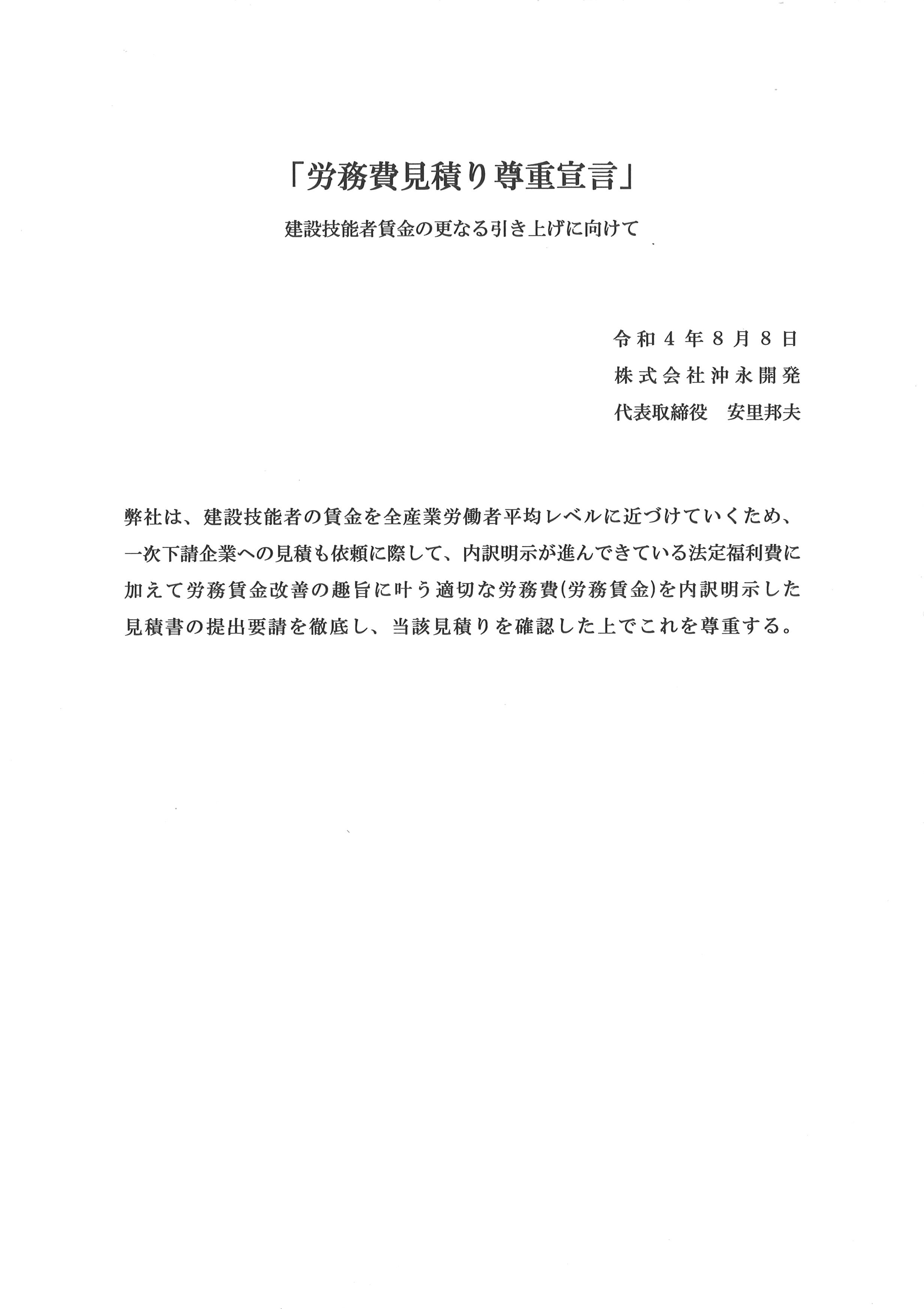 当社は、一般財団法人日本建設業連合会の「労務費見積り尊重宣言」に基づき、協力会社への見積り依頼に際して、
