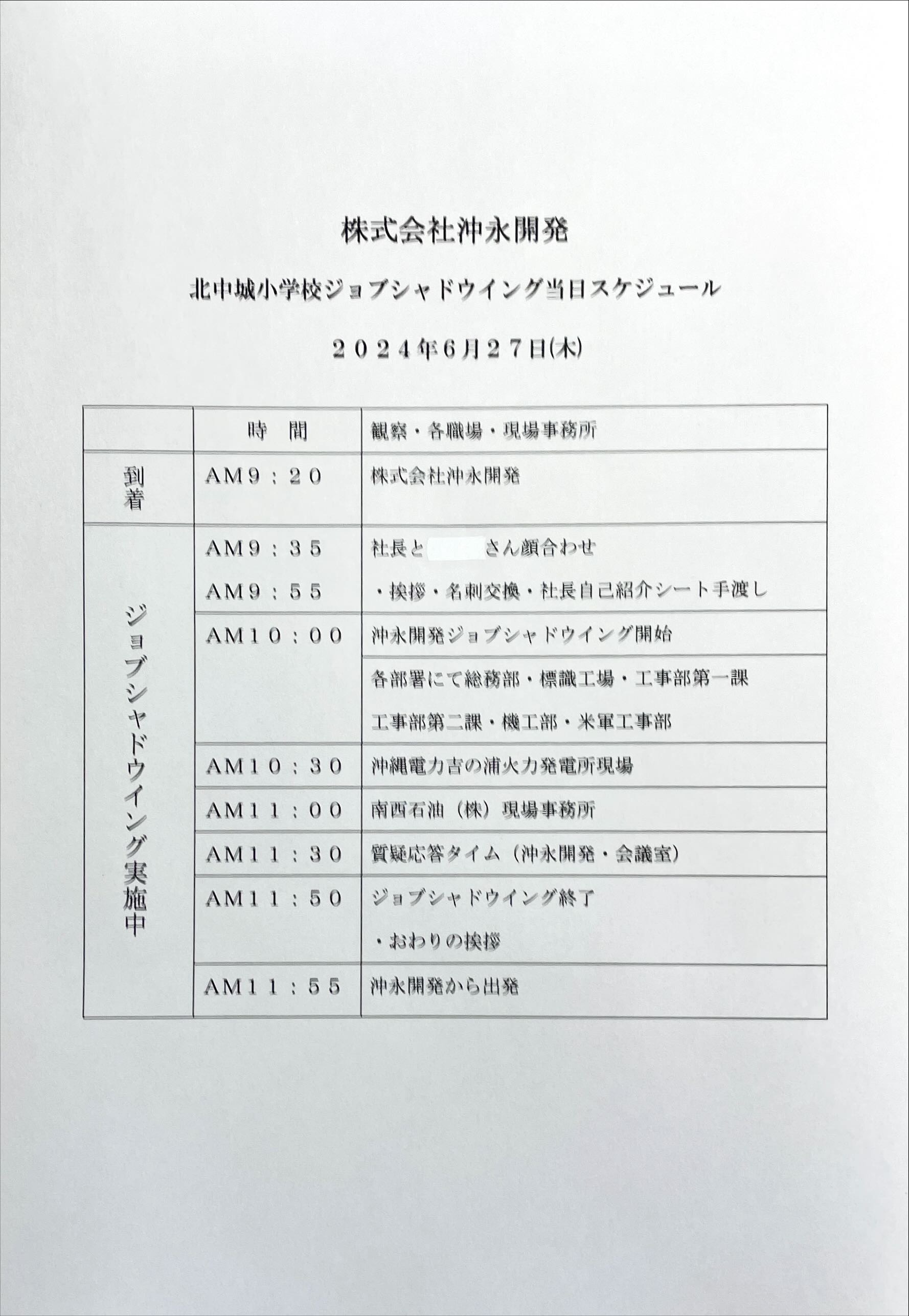 6月27日ジョブシャドウイングを実施しました。北中城小学校6年生1名を受け入れています。