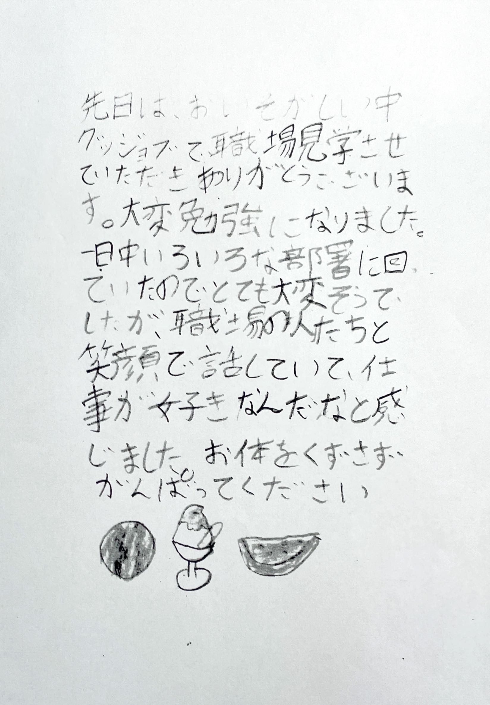 ジョブシャドウイング終了後に、生徒さんより感想とお礼のハガキが届きました(^O^)/ありがとうございます。
