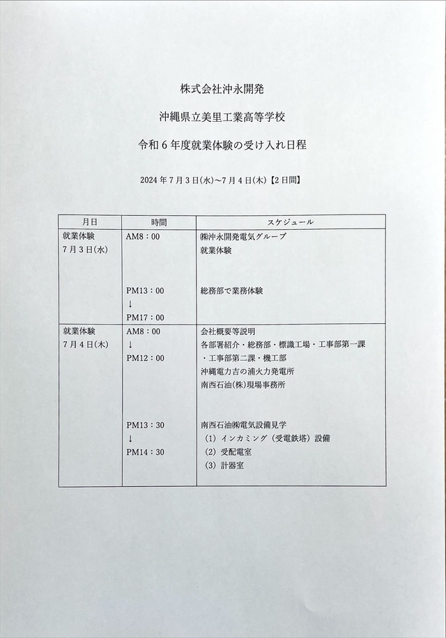 7月3日~7月4日の2日間 令和6年度・就業体験(インターンシップ)、沖縄県立美里工業高等学校より2年生2名の生徒さんを受け入れ就業体験を実施しました。