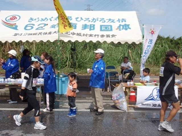 弊社も、事業本部がある北中城村の渡口交差点付近で、北中城村役場のボランティアの皆様と共同でブースを設けて、ジョガーたちに声援をおくりました。