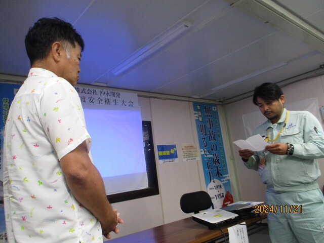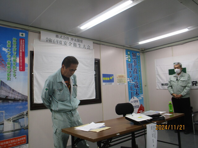 令和6年11月21日、(株)沖永開発は令和6年度安全衛生大会を開催しました。私たち沖永開発および協力社員、協力会社一同は、安全管理の重要性および労働災害防止活動の重要性を再確認し、この大会を機に無事故・無災害への決意を新たに致します。災害防止対策に全力で取り組んで参ります。