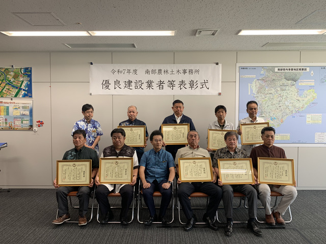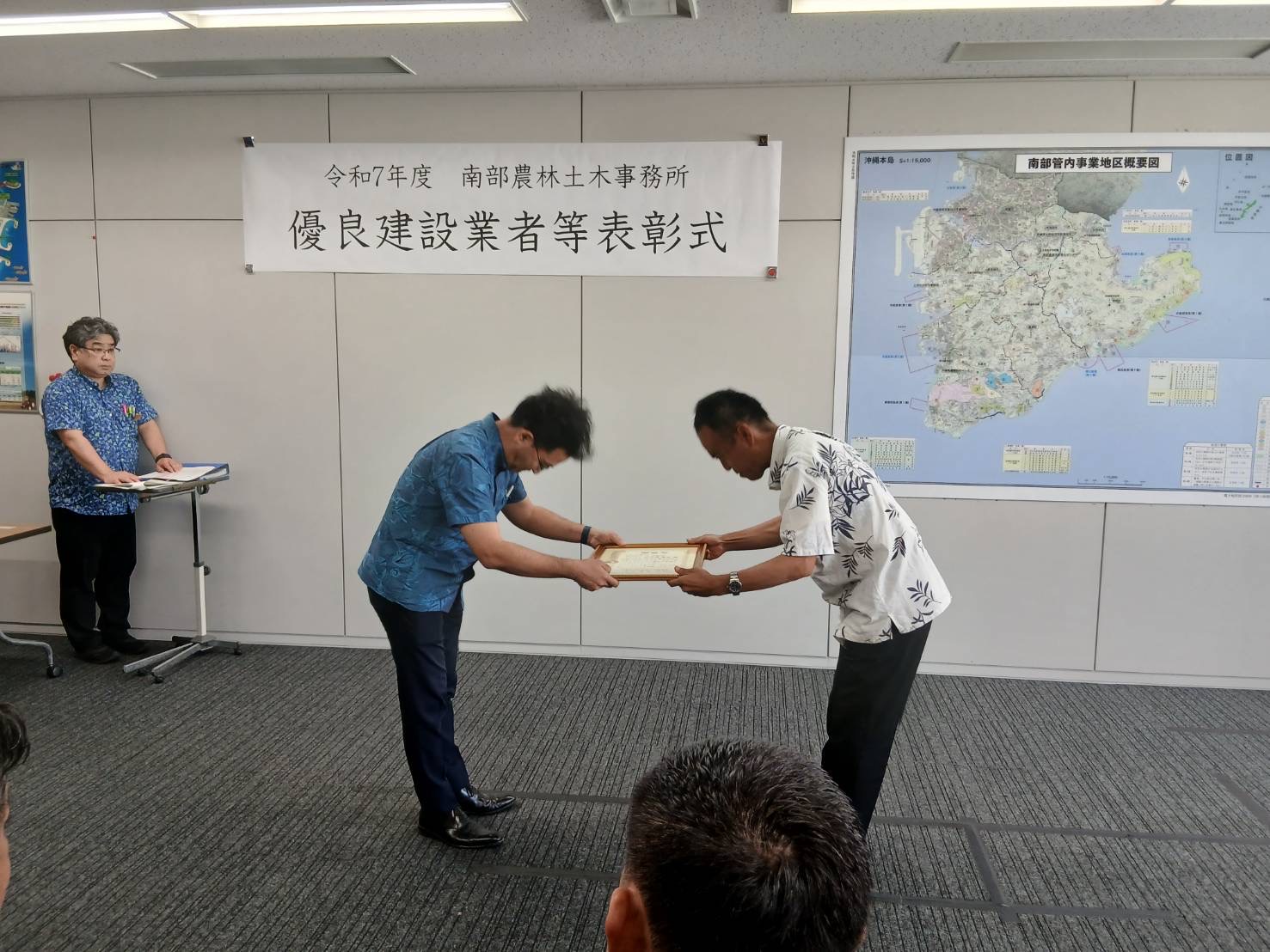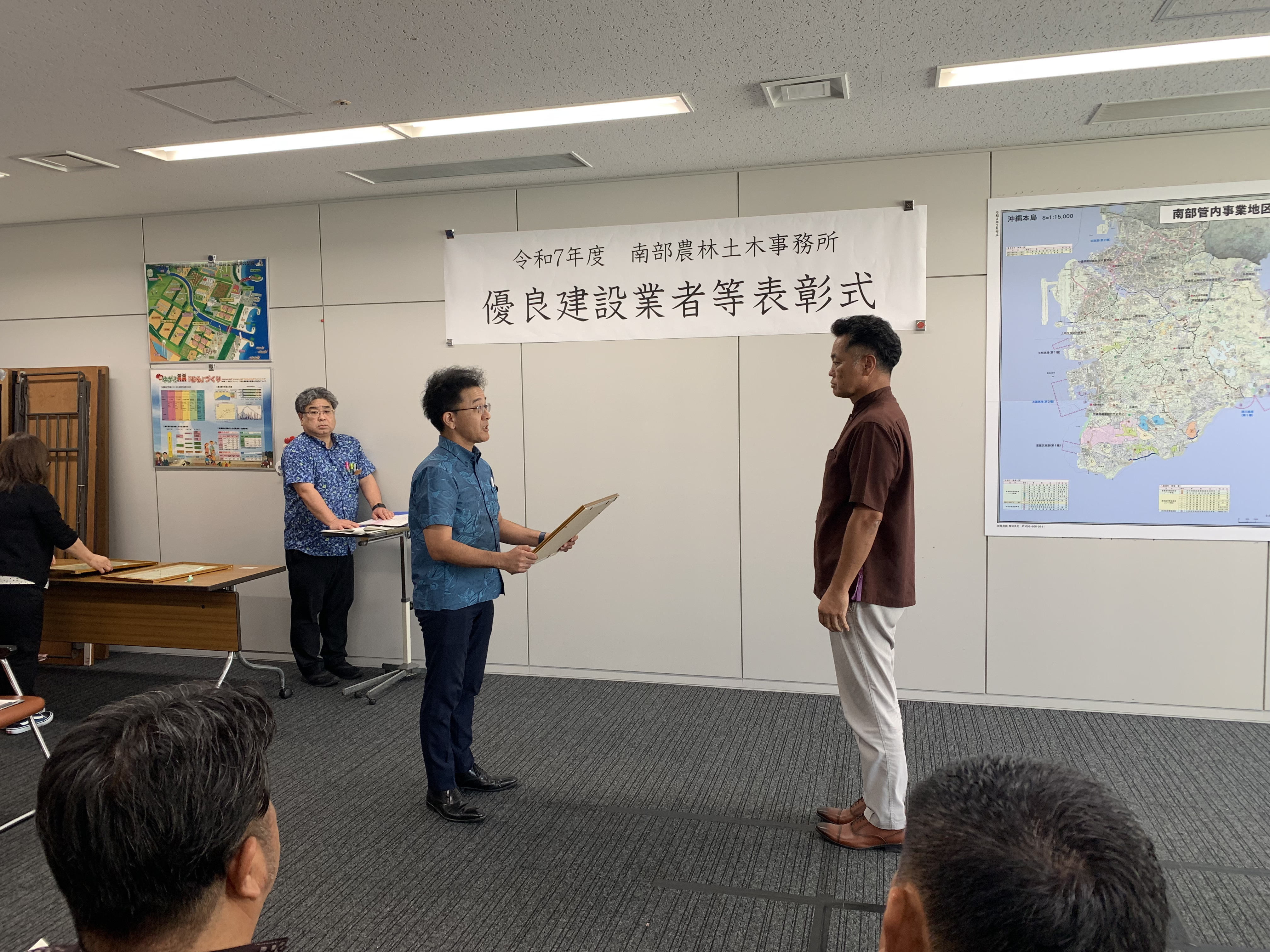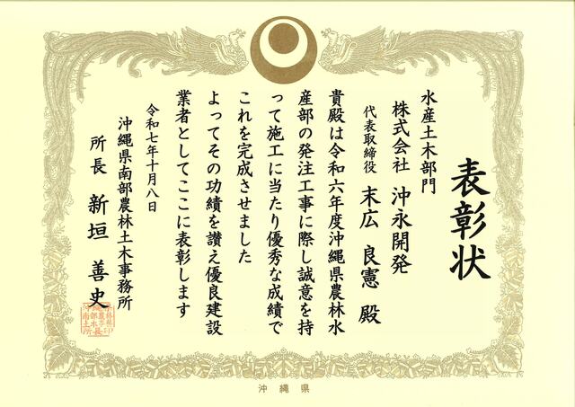 令和7年10月8日(水)、沖縄県南部農林土木事務所より当社施工現場「沖縄地区(中城)中層型浮魚礁回収設置工事(R5ゼロ国)」が事務所長表彰(水産土木部門)を受賞しました。