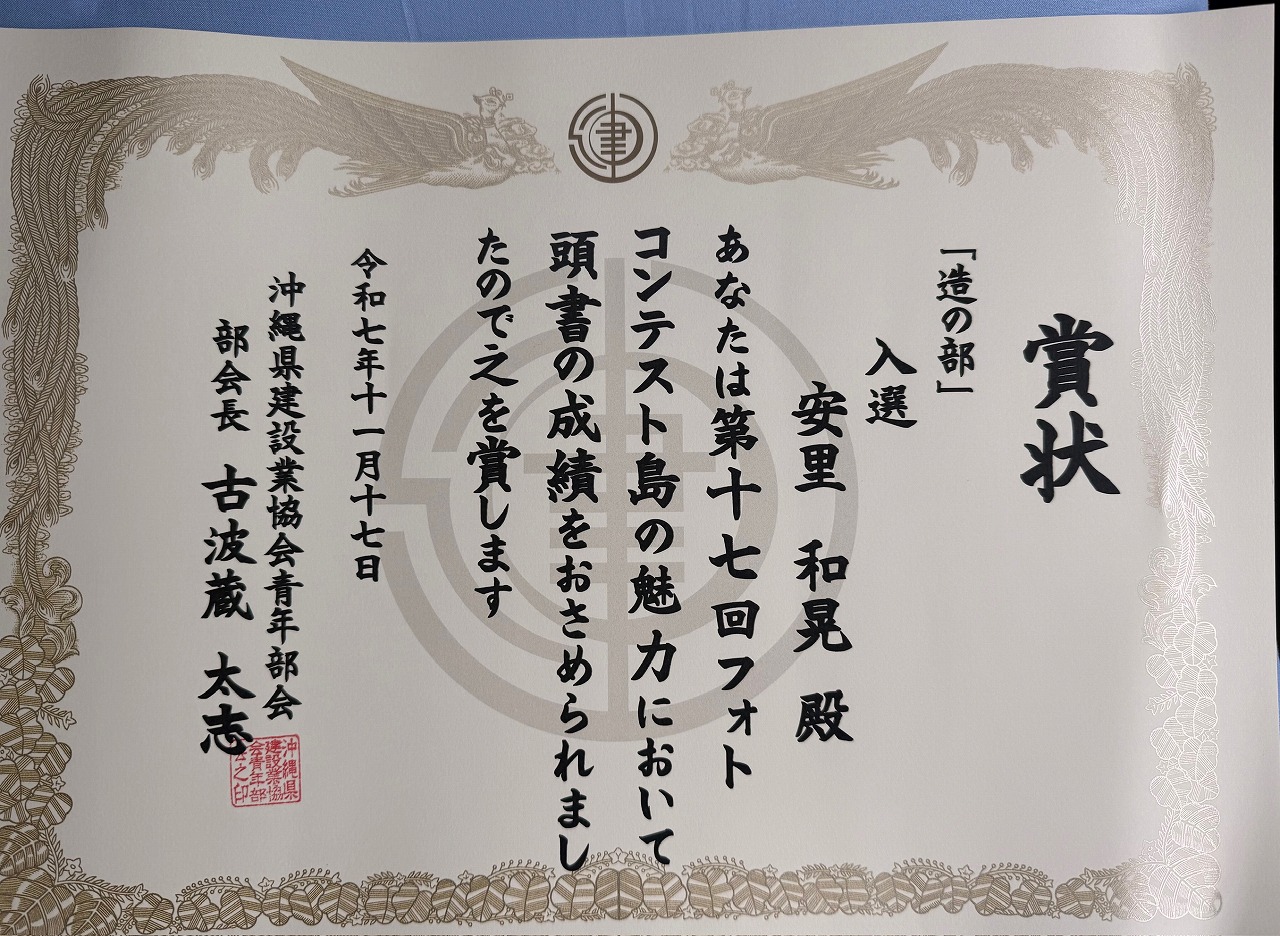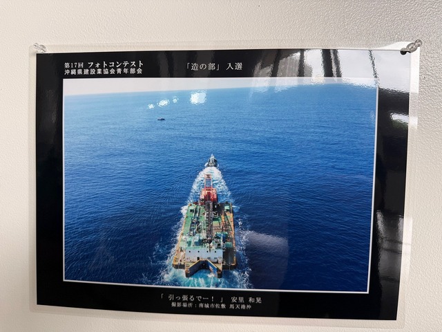 このたび、沖建協青年部会主催「第17回フォトコンテスト~島の魅力~」において、工事部、安里和晃氏が「造の部」で見事に入選いたしました!!日々の仕事で培った視点と感性が、島の魅力を映し出す作品として評価されたことは、私たちにとっても大きな喜びです\(^o^)/。県庁にて展示されている様子をお届けします。