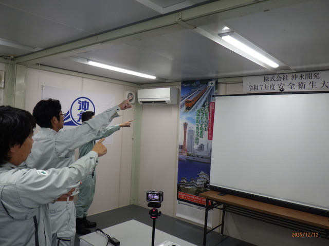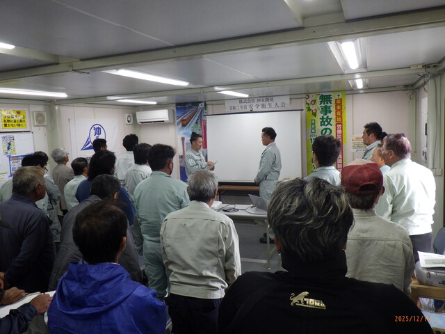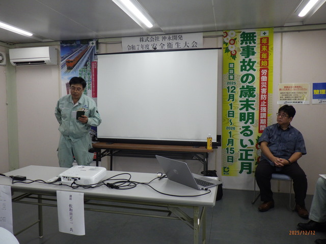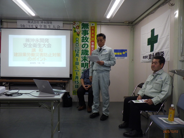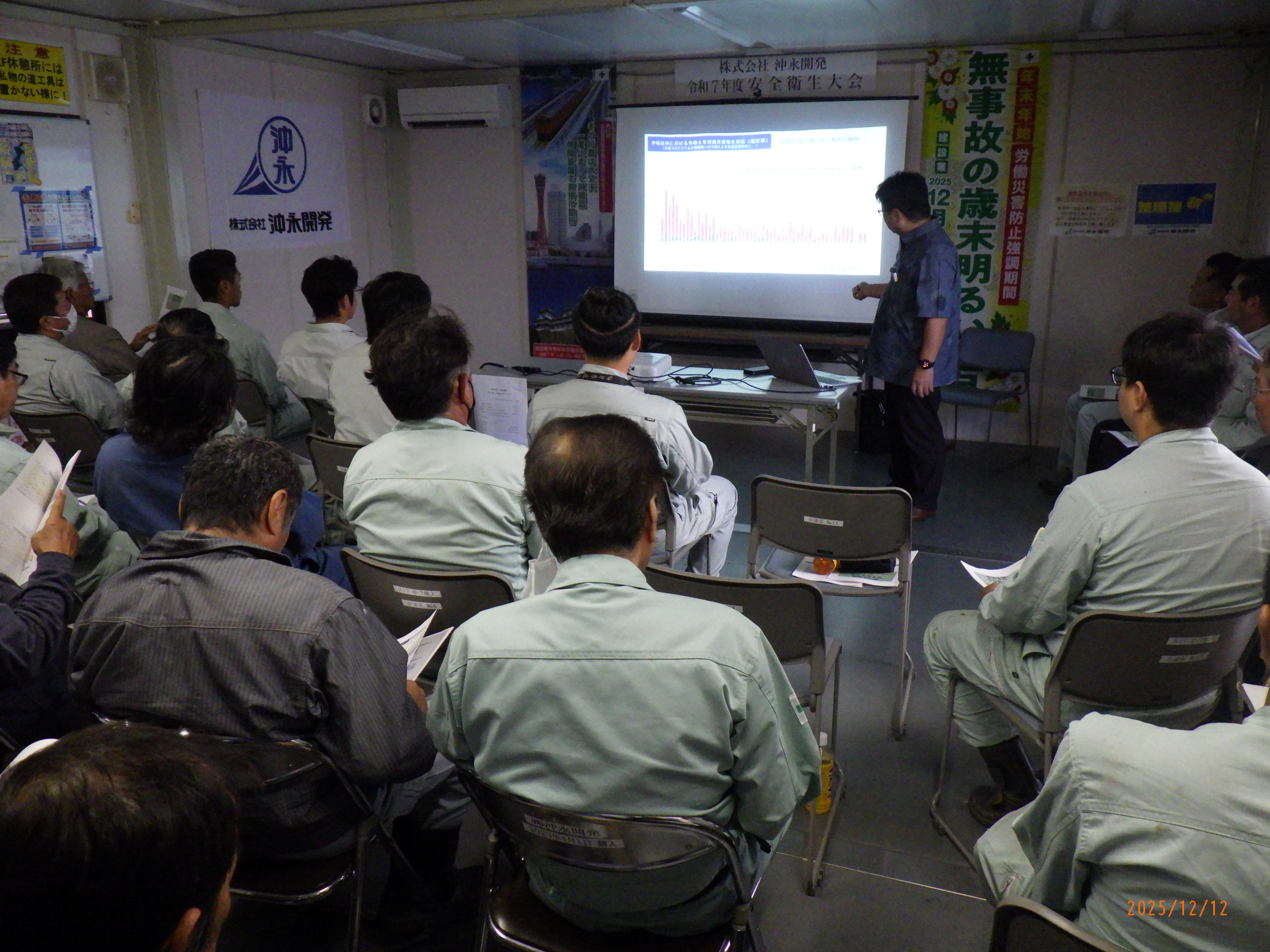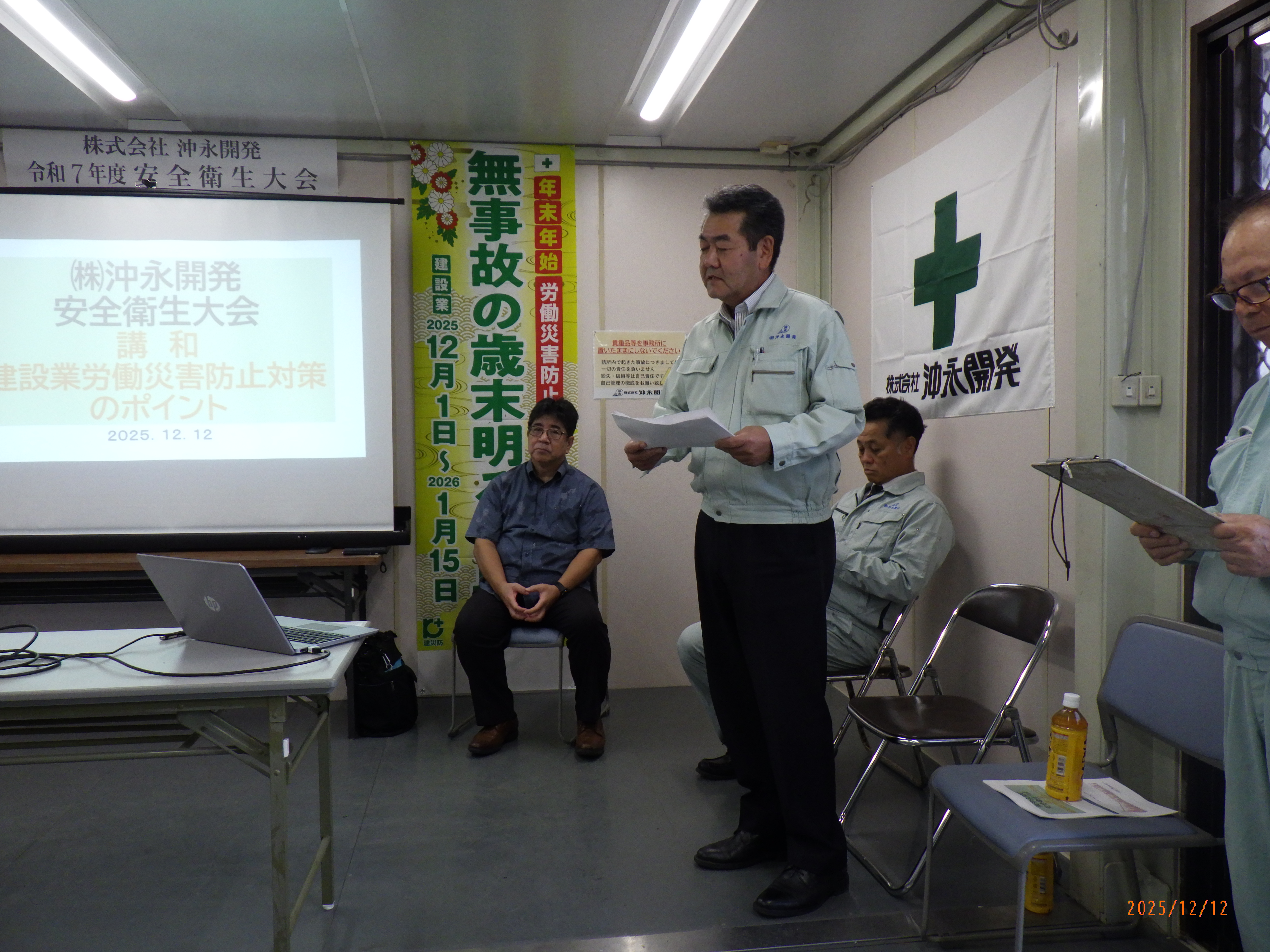 令和7年12月12日(金)社内安全衛生大会を開催しました。講師をお招きし、建設業における労働災害防止をテーマに講和いただきました。内容は、建設業の労働災害防止対策のポイントや、過去10年間の死傷災害から学ぶ「安全・健康は建設現場の原点」といった視点に加え、沖縄県内における令和6年の労働災害発生状況について、概況、建設業における災害、死亡事故災害の事例をもとに解説いただきました。バックホウ、クレーン付きトラック、高所作業車、酸素欠乏など具体的な事例を通じて、災害発生のパターンを知り、未然防止につなげる重要性を学ぶ機会となりました。さらに令和7年の労働災害防止に向けて、重点的に取り組むべき事項として、墜落・転落災害の防止、建設機械やクレーン等による災害の防止、転倒災害の防止、不安全行動による災害の防止、職業性疾病の防止、化学物質による健康障害の防止について周知が行われました。今回の大会を通じて、参加者一人ひとりが「安全はすべての原点」であることを再認識し、日々の業務において安全意識を高める大切さを共有しました。今後も災害を未然に防止し、安心して働ける職場環境づくりに取り組んでまいります。
