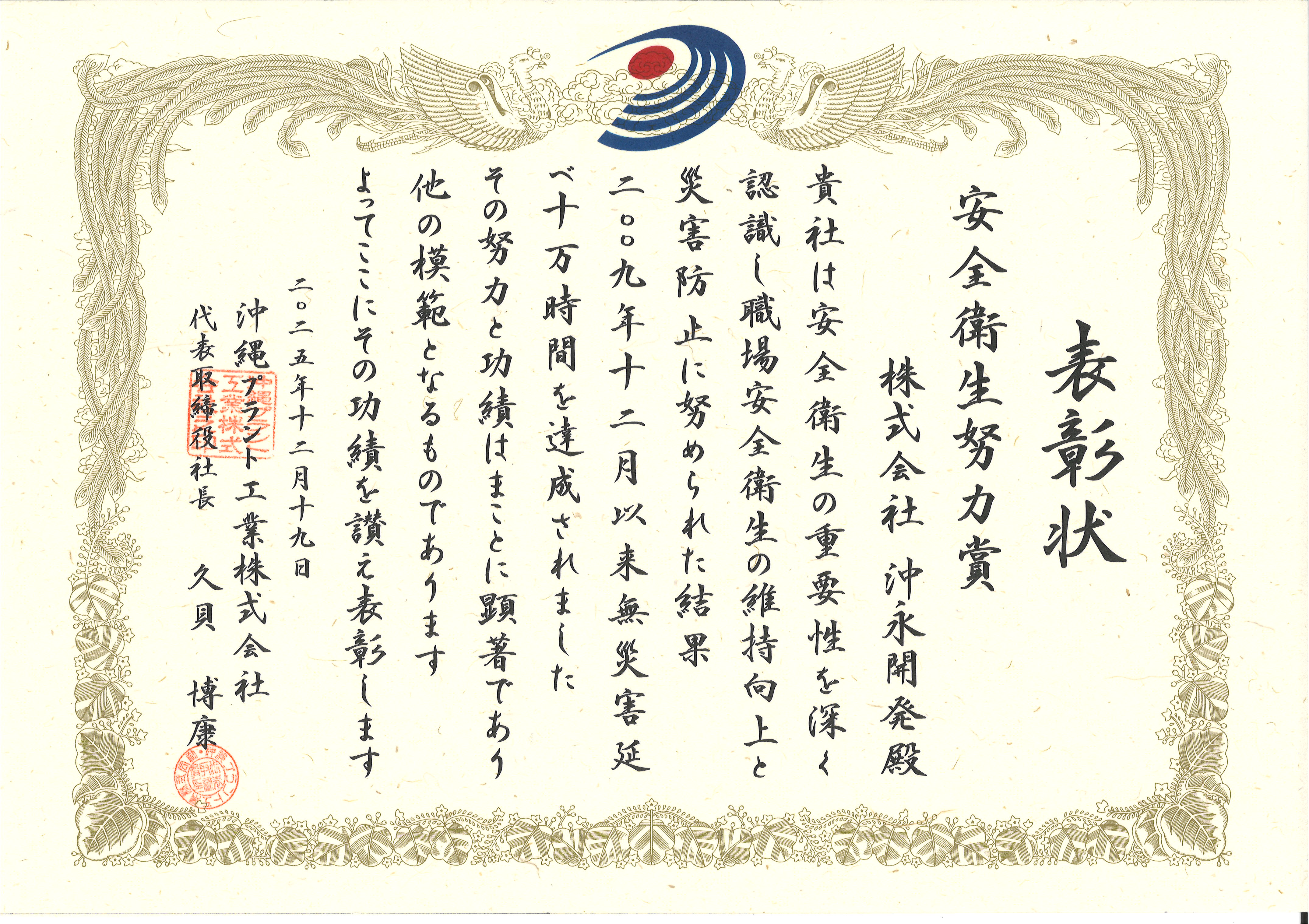 このたび、当社は沖縄プラント工業株式会社様より「安全衛生努力賞」を受賞しました。当社では、日頃より安全衛生管理活動の徹底と職場環境の改善に取り組み、社員一人ひとりが「安全最優先」の意識を共有しながら業務を進めてまいりました。今回10万時間無災害を達成したことが高く評価され、表彰いただいたものです。今回の受賞を励みに、今後もより一層、安全で安心して働ける職場づくりに努めてまいります。引き続き皆さまのご支援とご協力を賜りますようお願い申し上げます。
