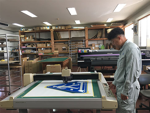 デザインデータのカッティングフラットベッドカッティングプロッタを使用し、反射シートに指定されたデザインデータを正確にカッティングします。
