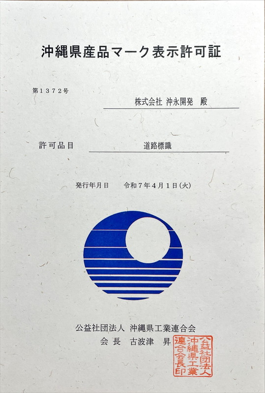 沖縄県産品マーク表示許可証(第1372号)推奨マーク・認定取得